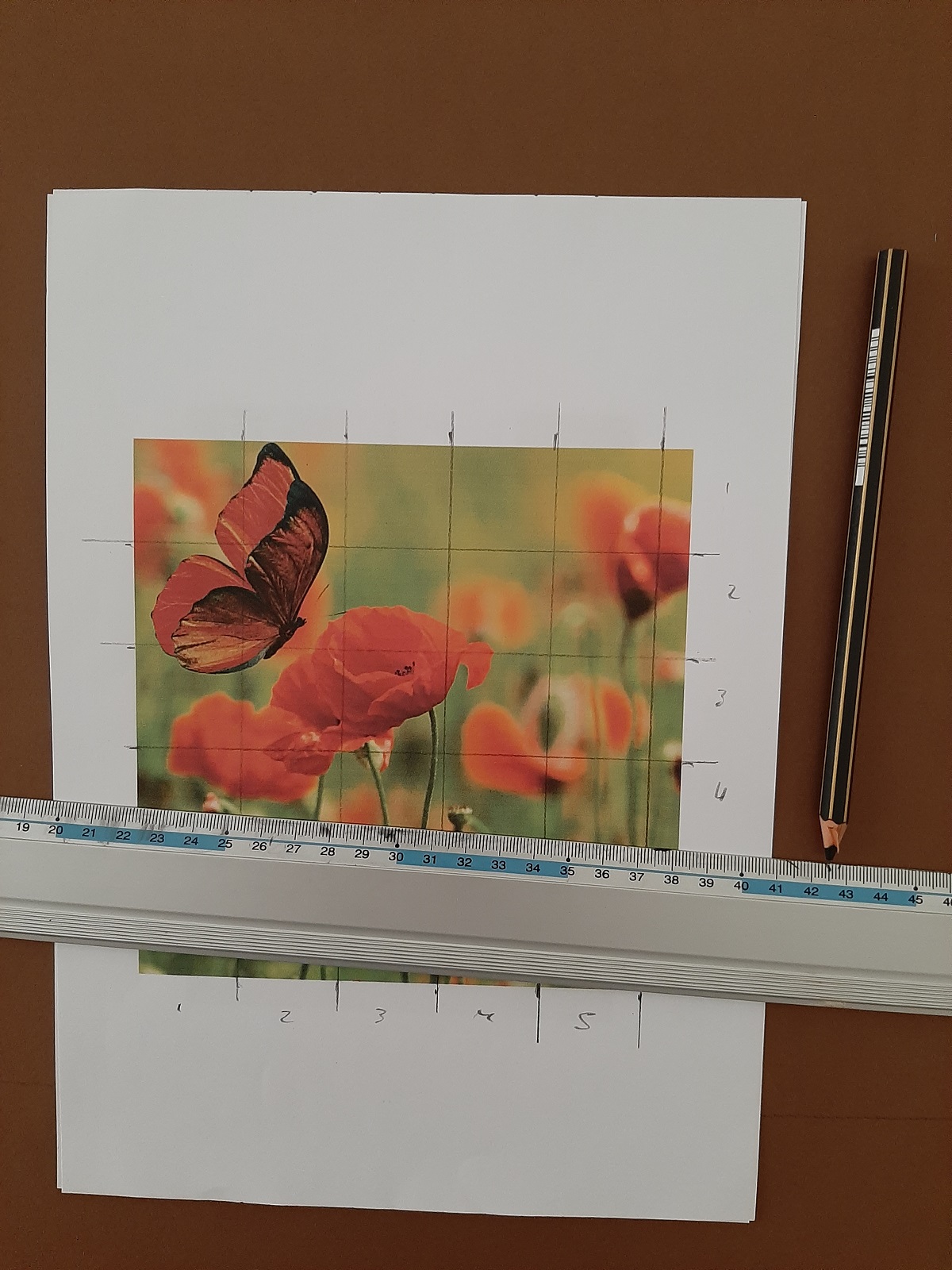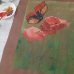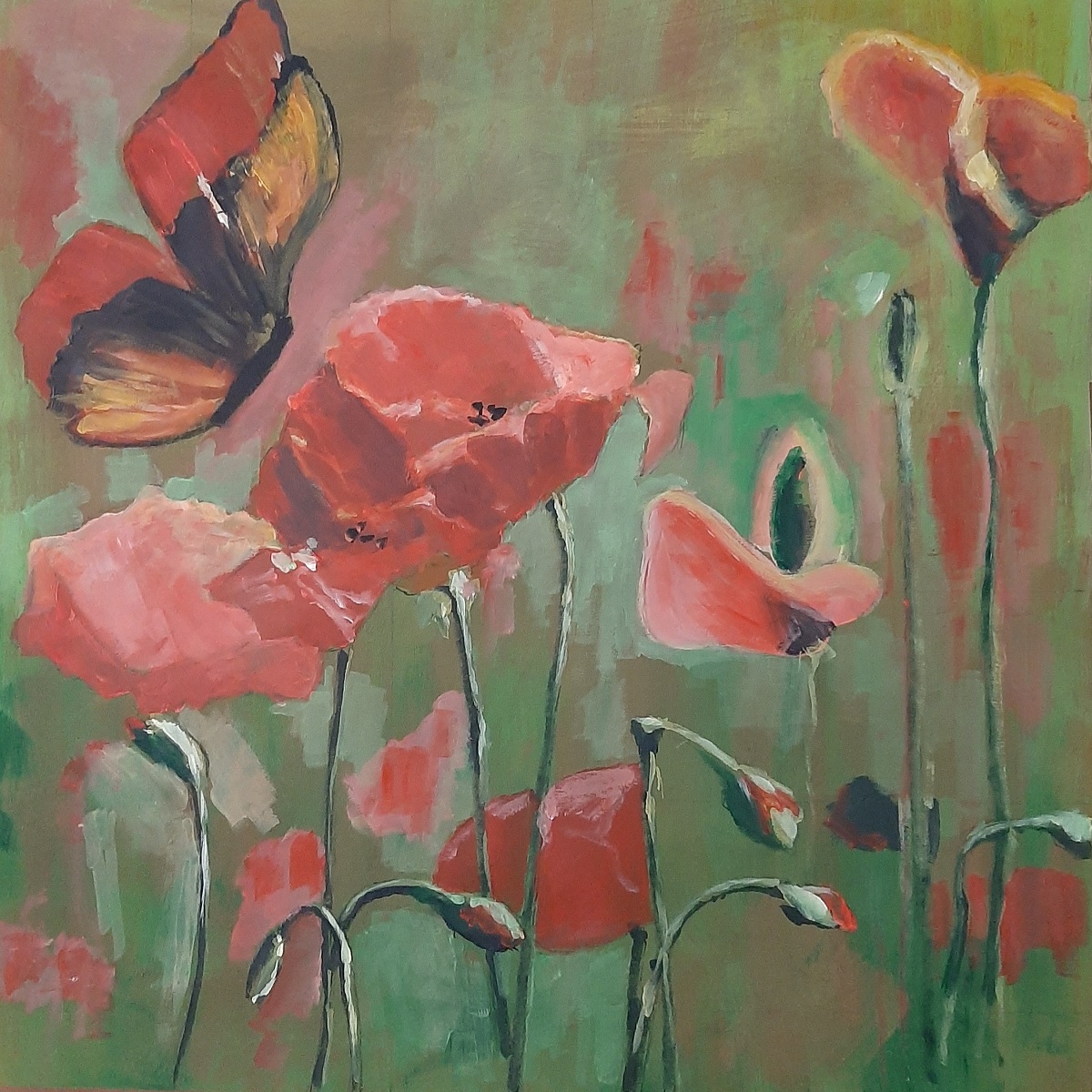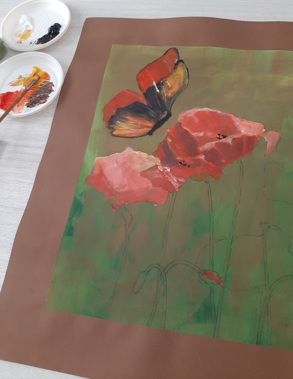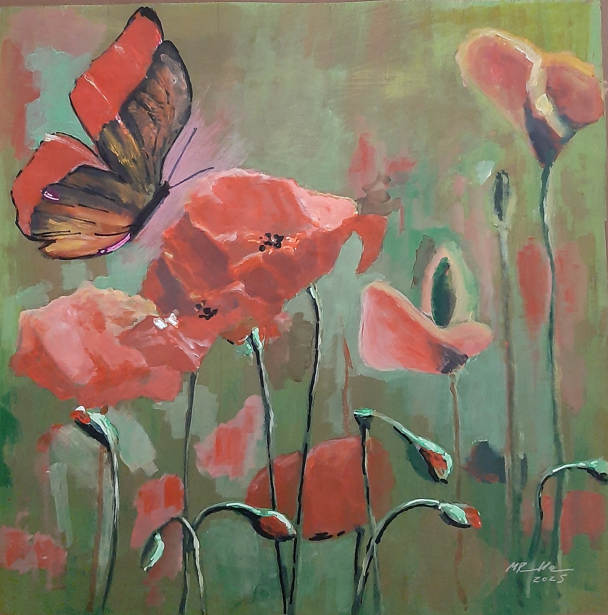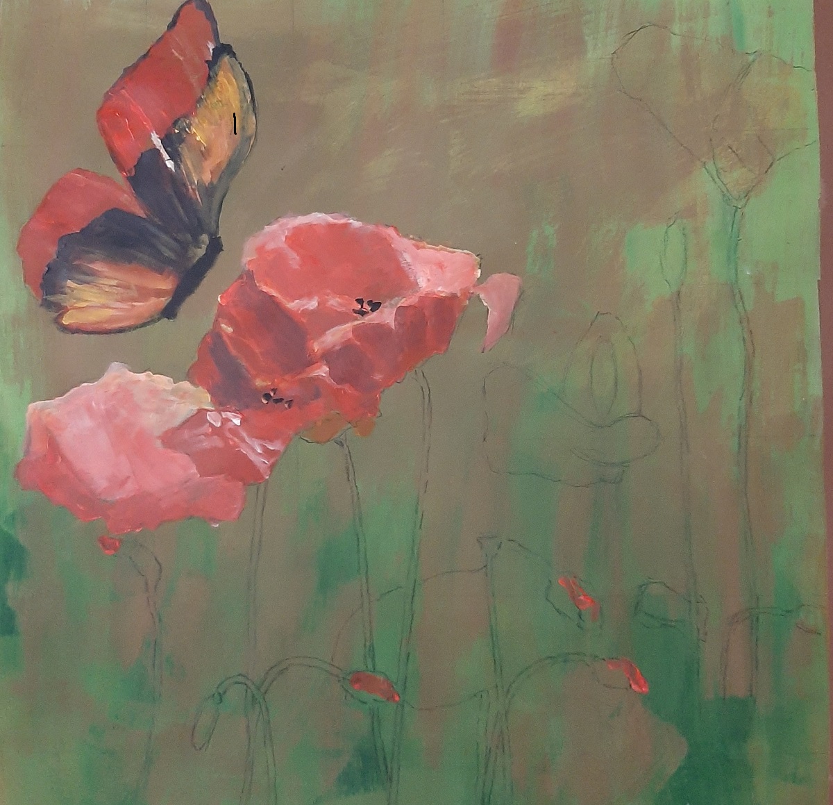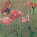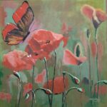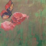 Farfalla e papaveri, 2025, acrilico su carta